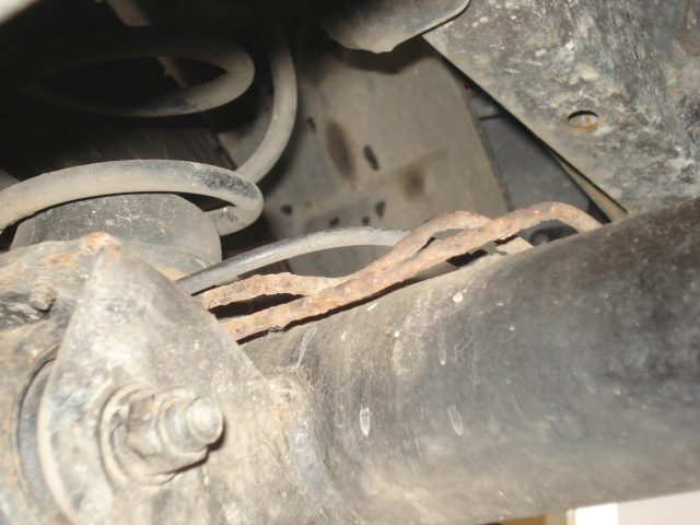 点検したところフロントの足廻りにくくりつけられている、4WDのオートハブロックのエアーホースから